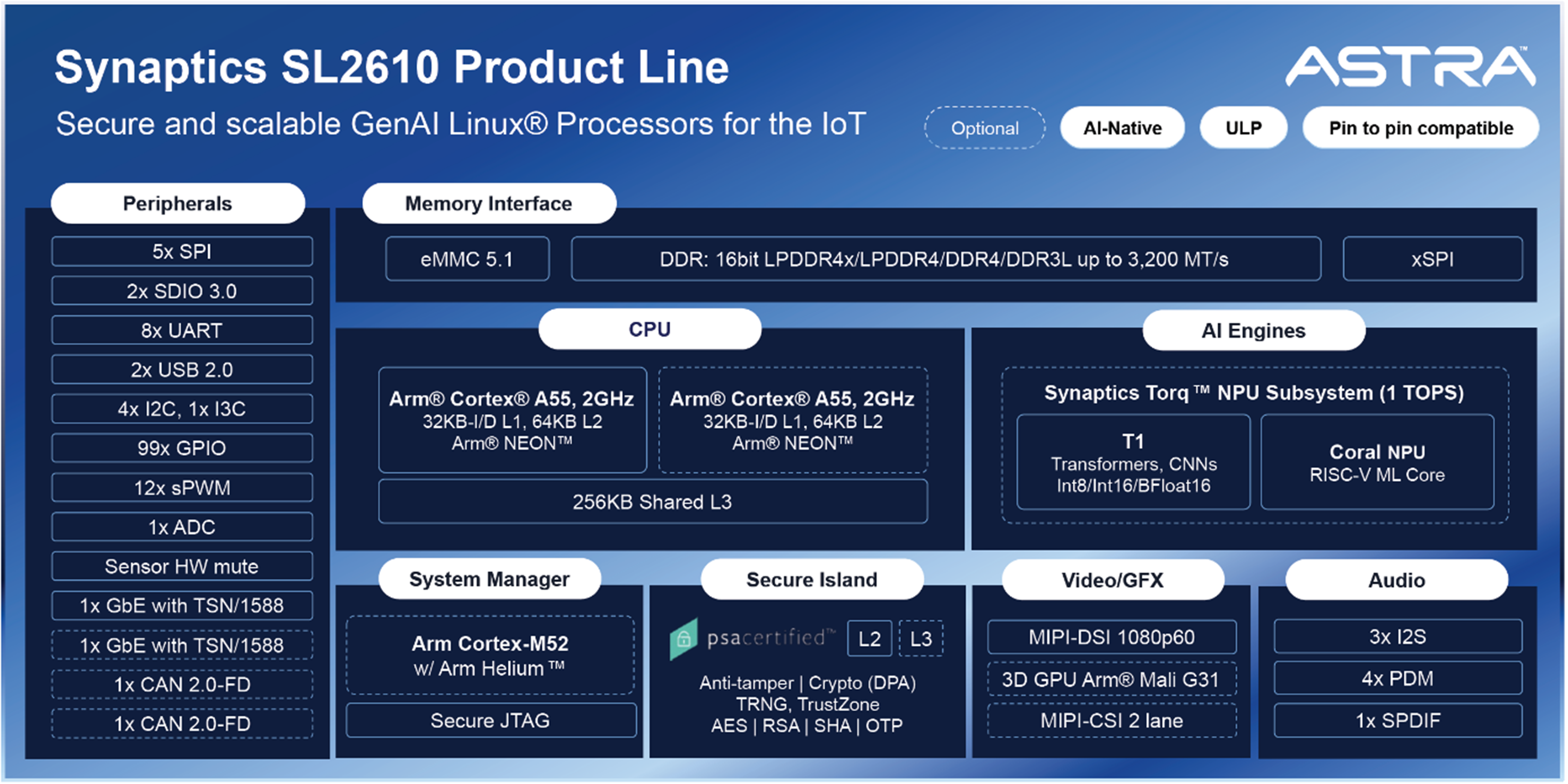 With the Astra SL2610, SYNAPTICS continues to advance its strategic focus on AI-native edge computing. The processor delivers scalable performance for multimodal AI workloads in IoT, industrial, and consumer applications, featuring a 1 TOPS NPU (optimized for transformer models), dual-core Arm® Cortex®-A55 CPUs, and an energy-efficient Cortex-M52 core with Helium DSP extensions, providing high-performance AI inference at minimal power consumption and low cost.